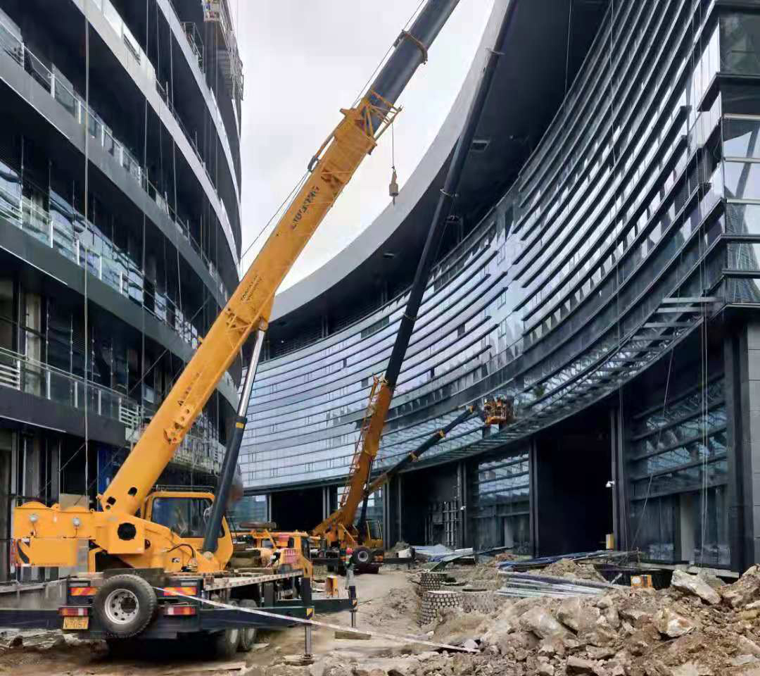 項目東側建筑高度為31米的大型球型網架結構鋁板安裝,施工難度大、危險系數高;