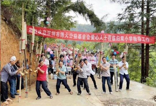 4月21日至22日,深圳市博大公益基金會理事長、集團董事長張炳來前往貴州省黎平縣實地考察擬捐建學校場地,并回訪2021年交付當地政府使用的務孖小學。當地群眾載歌載舞,熱烈歡迎理事長張炳來的到來。