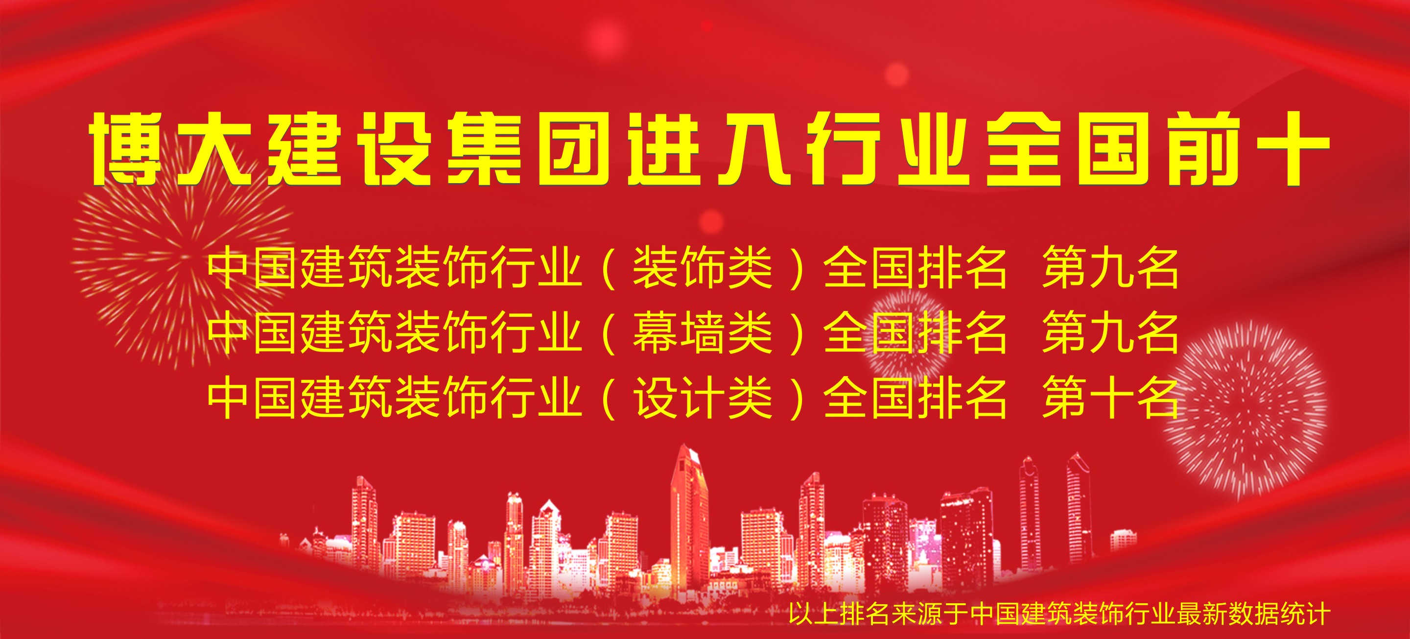 2019年1月9日,中國建筑工程裝飾頒獎大會在北京隆重舉行,根據(jù)中國建筑裝飾行業(yè)綜合數(shù)據(jù)統(tǒng)計,博大建設集團憑借綜合實力,以奮進姿態(tài)挺進行業(yè)全國前十,其中,裝飾類排名全國第九、幕墻類排名全國第九、設計類排名全國第十。