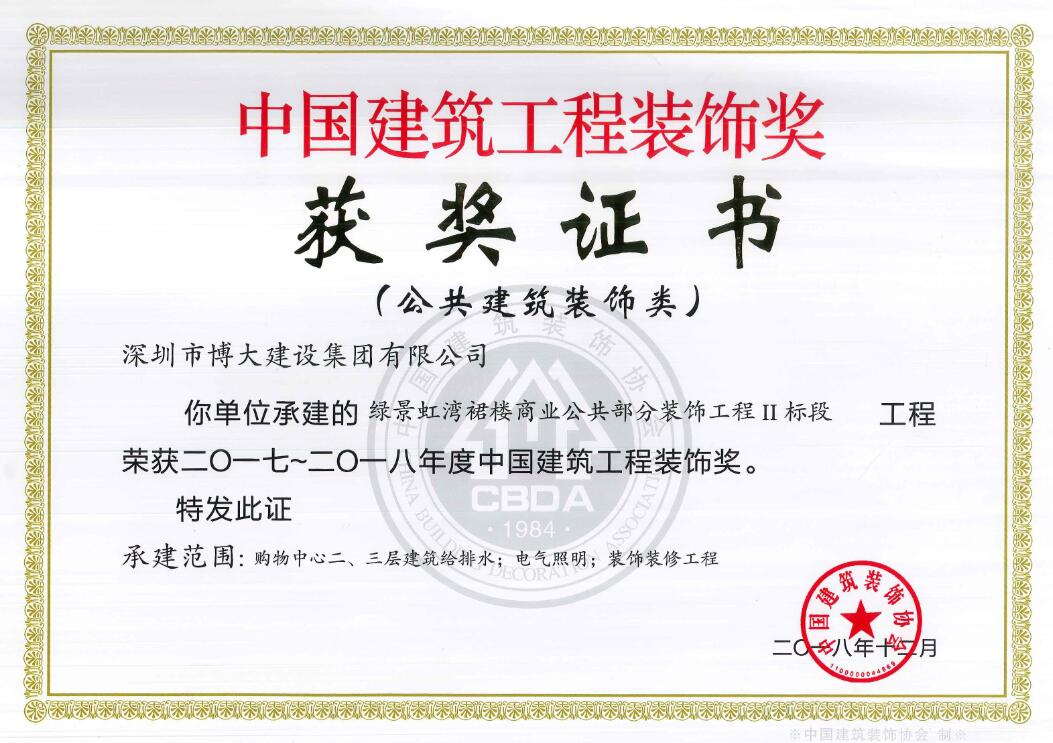 博大建設集團承建的昆明醫科大學第一附屬醫院3號樓、華遠金外灘四期君悅酒店、綠景虹灣裙樓商業公共部分、水貝金座大廈幕墻工程、天健科技大廈幕墻工程等5個經典工程以卓越品質榮獲中國建筑工程裝飾獎。
