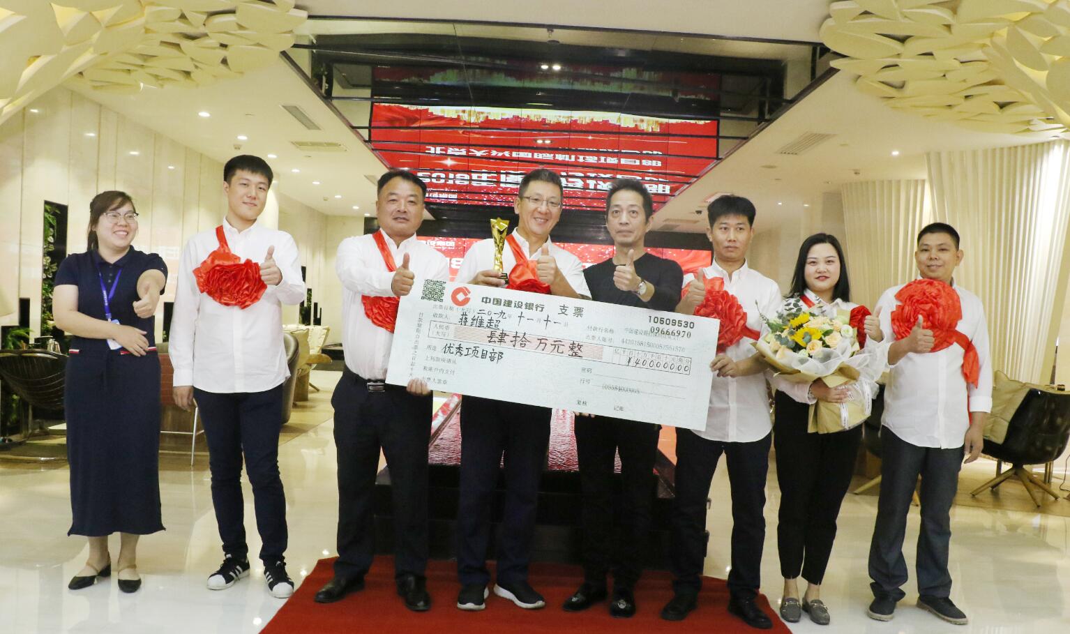 集團副總裁、幕墻中心總經理江東帶領團隊,在柳州會展中心二期幕墻工程中憑借精湛的施工、高效的服務,贏得客戶的高度認可,成功拓展柳州會展中心二期精裝修工程,被授予優秀成果獎。圖為黃河副董事長與獲獎者合影留念。