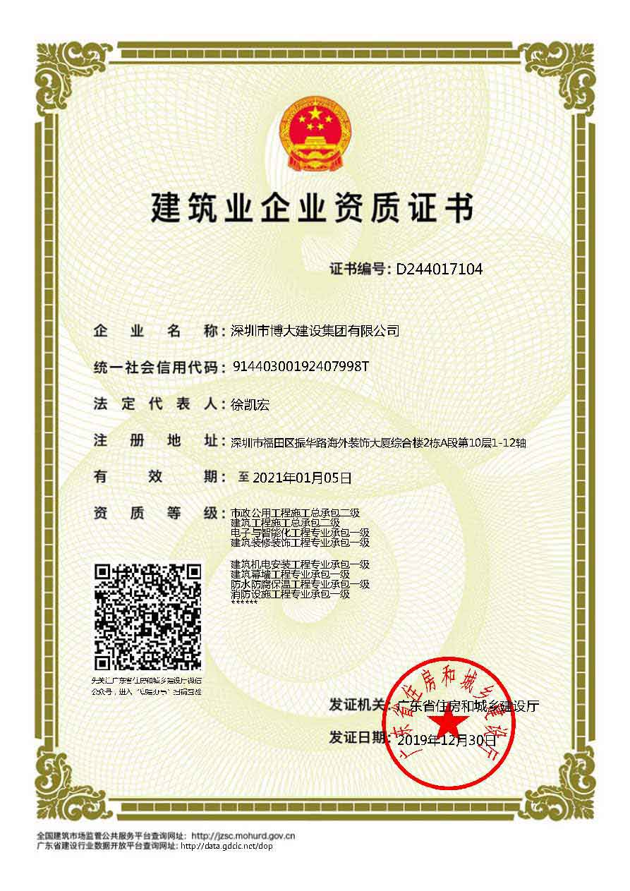 博大建設(shè)集團(tuán)作為行業(yè)最具發(fā)展活力的領(lǐng)軍企業(yè),近年來(lái)發(fā)展速度迅猛,2019年繼續(xù)保持穩(wěn)步增長(zhǎng),業(yè)績(jī)過(guò)百億。在各級(jí)領(lǐng)導(dǎo)的關(guān)懷和全體家人的共同努力下,集團(tuán)資質(zhì)建設(shè)取得新的進(jìn)展,榮獲6項(xiàng)建筑資質(zhì),具體如下: