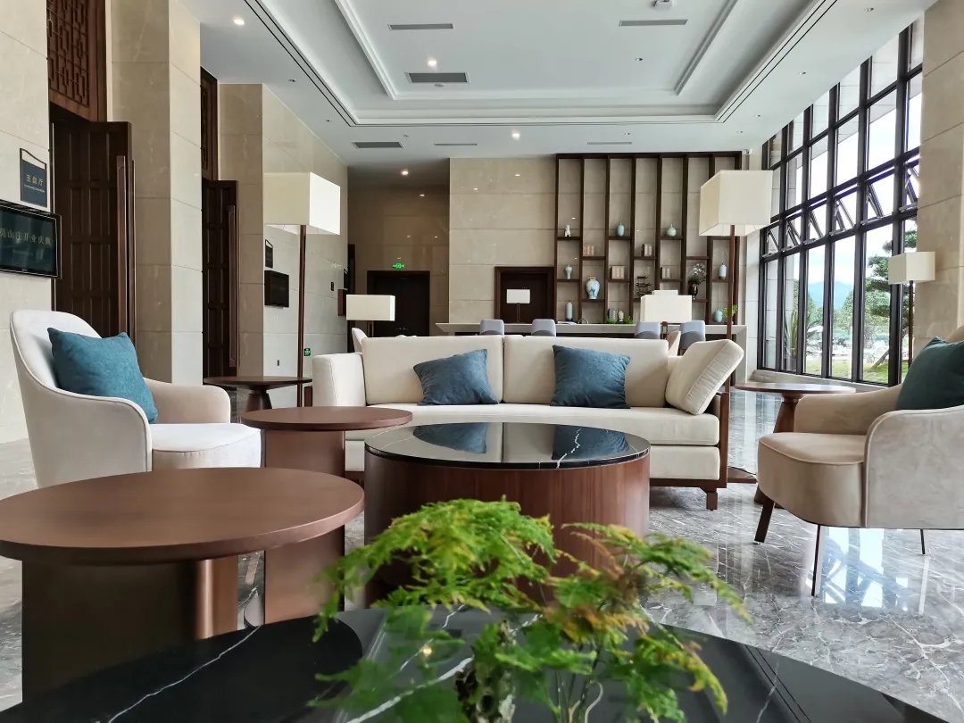 貴州山水特色“小時不識月,呼作白玉盤”,盤州月亮山莊酒店以“月”為主題,處處彰顯“月”的文化元素,“滿月”的石材造型屏風,用米黃色大理石干掛制作而成,表現“月”的圓滿,溫潤,也需要對石材獨具匠心的制作工藝。