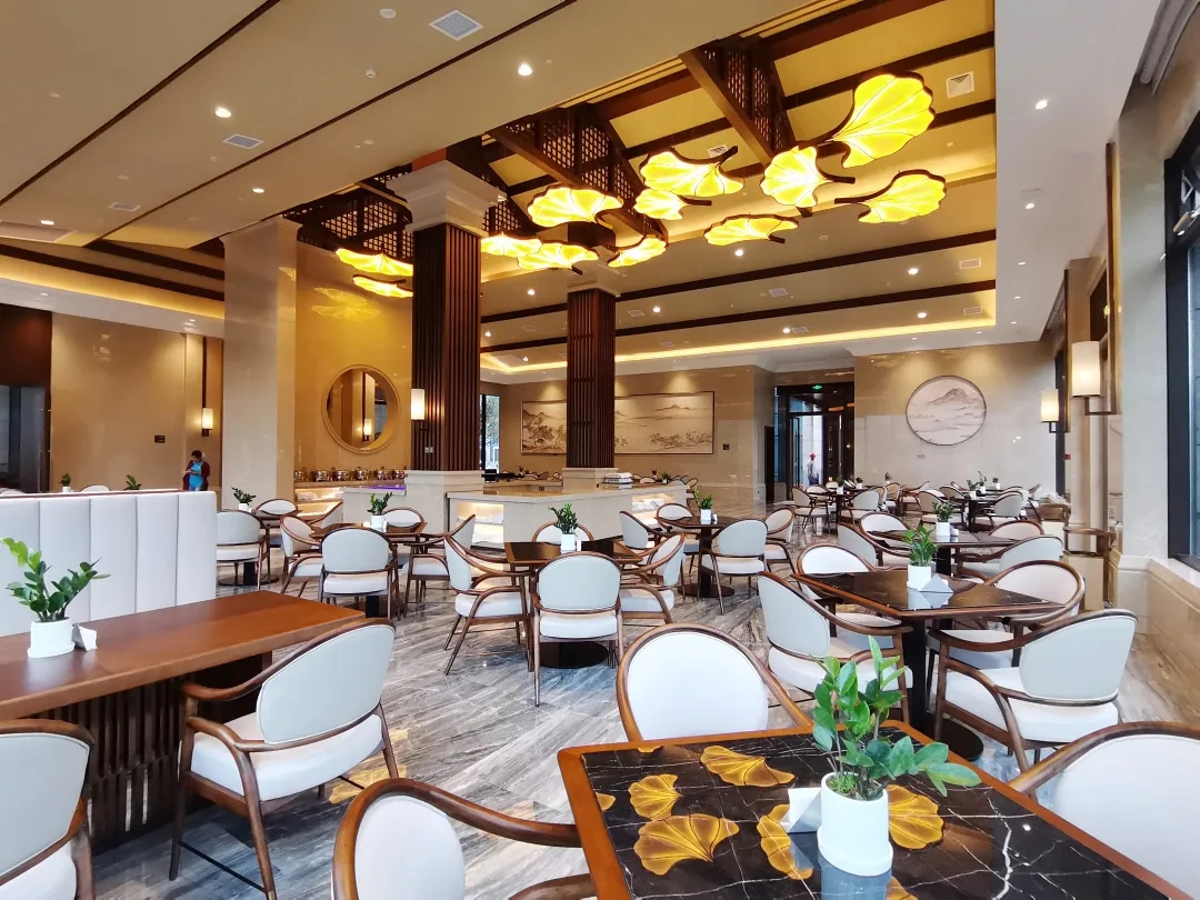 通透的全日制早餐廳,為客人帶來愜意的用餐時光。捫布硬包質感素雅,晶瑩剔透的大理石地面及布菲臺,打造此現代明快的用餐空間。