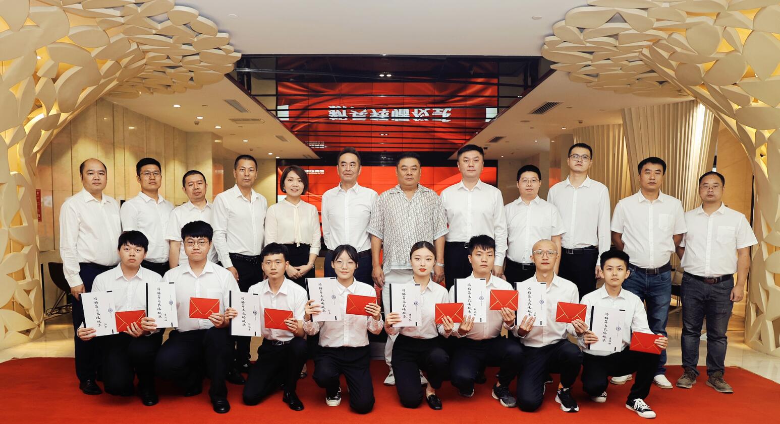 新兵代表與帶教師父,校董徐凱宏、洪宇,校長黃河,執行校長劉子蓮合影