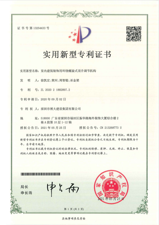 專利成果分別是《室內建筑裝飾用環(huán)繞螺旋式頂升調節(jié)機構》、《一種GRG吊頂安裝結構》、《一種PC預制混凝土構件下的特大推拉窗》、《一種帶有支撐構件的超大空間頂轉換層結構》、《一種單元拼接式鋁板吊頂或裝飾線條》等22項獲得由國家知識產(chǎn)權局頒發(fā)的專利證書。